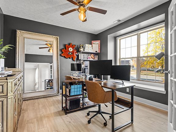 Wood burning fireplacePrimary suiteFormal dining roomFrench doorsLarge picture windowRoomy officeNewer stainless appliances