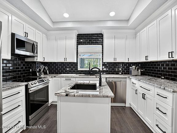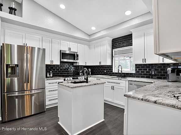 Looking for that Pool Home that checks all the boxes? Look no further!! This gorgeous 3 bedroom, 2 bath, 2 car garage pool home sits on a .8 acre corner lot in the highly desirable area of Royal Highlands just minutes away from the up and coming Lake Hideaway Lagoon and Weeki Wachee (Home of the Mermaids) State park. Walk in the front door and notice the open - split floor plan and vaulted ceilings with the gorgeous upgraded kitchen (2024) with granite countertops, plenty of cabinet space, and recessed lighting as your main focal point. Newer flooring (2023) a sleek, ceramic tile that looks like wood planks throughout the entire home certainly gives it that upscale feel. The pool addition was added in 2022 with a large screened in Lanai and lounge space with pavers throughout. New roof installed in 2023, New filter-less A/C HVAC system (2024), and a new well and water softener system (2025).