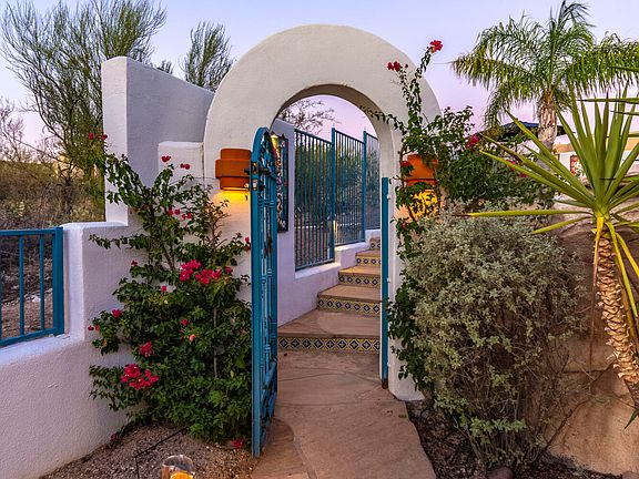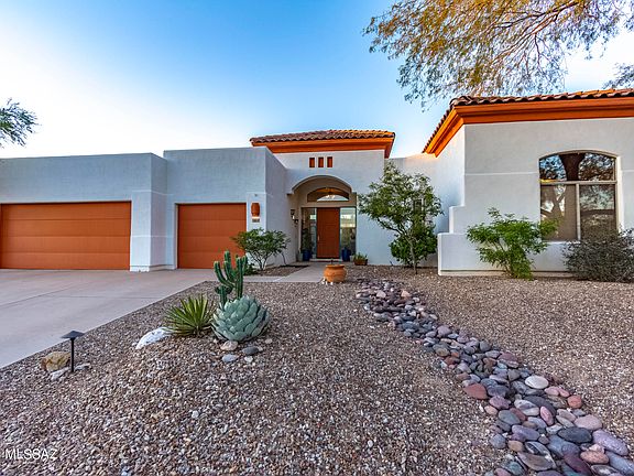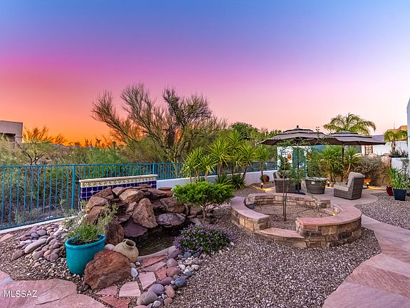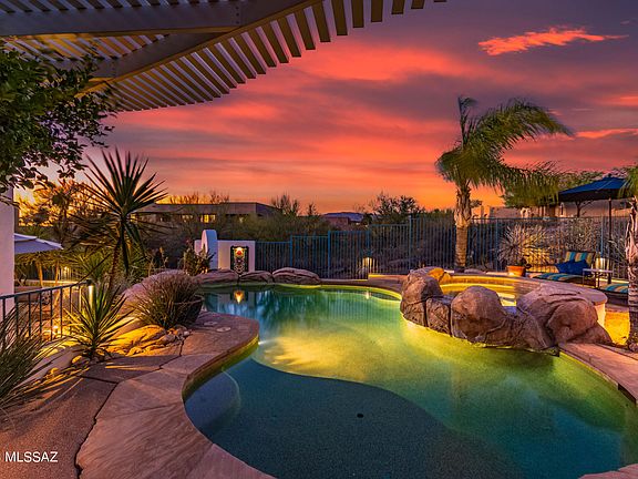 Absolutely stunning home on over a half acre with gorgeous pool and spa. Immaculate with beautiful tile throughout the entire home. It shows like a model with tasteful designer colors, accents and high ceilings. Now let's talk about the amazing backyard that can serve as an entertainer's delight and your very own Mediterranean oasis. Plenty of seating areas to enjoy amazing sunsets, inlcuding a new ramada. The pool area is surrounded by very unique rock looking creations that sets this pool apart from most any in Tucson. A pergola offers plenty of shade to lounge by the pool, forgetting you are in your own backyard and not at some luxury resort. This home has been very loved and is ready for it's next adventure and so many memories to be made.