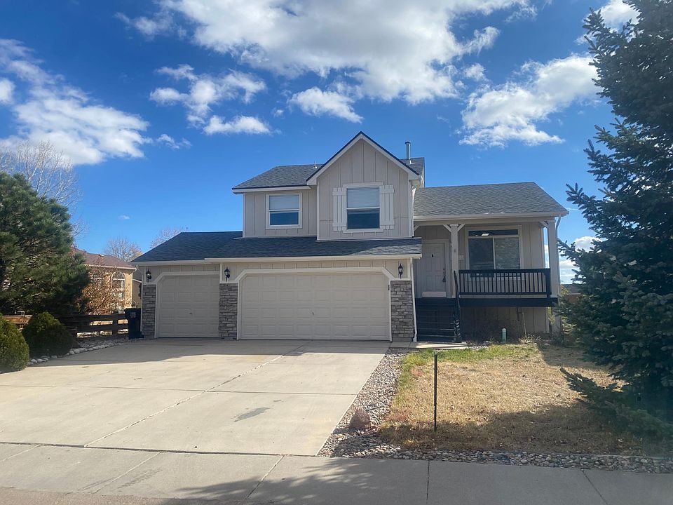 This Meridian Ranch home is located within half a block of the community Recreational Center. Pool, 500 acres worth of parks and trails, golf, D49 schools, restaurants, shopping and 30mins from downtown, 20mins to Peterson, less than 10mins to grocery stores and shopping. The house has 3 bedrooms, possible 4th in basement, 3 baths a 3 car garage and a large yard. Tri level home with a finished basement that walks out to the backyard! Walking up to the front door you will enter the home and will be greeted by the open and bright living room which overlooks the kitchen. The updated kitchen appliances included! The lower level has a fireplace and garage access. Finally the walkout basement! 3/4 bath makes this basement a perfect additional bedroom, office or cozy family room! The property sits on a large lot, large backyard, great driveway and oversized garage. Additional fees are required per month to cover $235: rec center, basic water use and sewer. Home offers an open airy feel with updates throughout. Lovely modern kitchen with tons of cabinets. Three car garage also has a walkout to the backyard. Easy access to Powers, Hwy 24, Air force bases and more. Tenant Pays Water and Rec fees for community. $235 per month for water, sewer and community fees for Pool and rec centers. $300 non refundable pet fee. No Cats. Dog has to be approved by owner. Visit HOA to read about the community! Pool, Parks, Golf, Rec Center, Trails, utilities details and more. 500 acres of trails and parks. D49 Schools.
