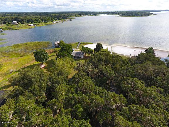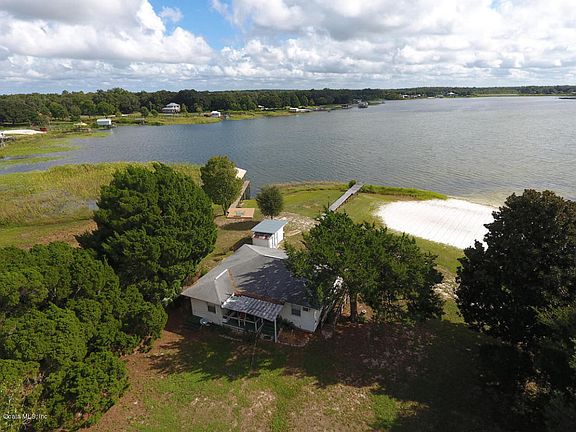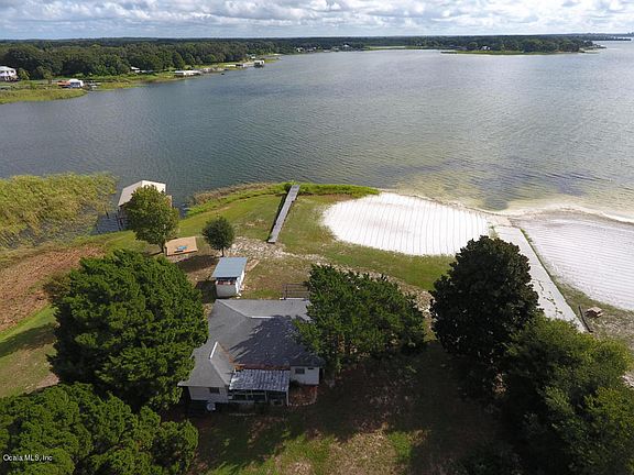 Lake Weir Living or a weekend Retreat either way with 100' of lake frontage, dock and a sandy white beach this lake house is for YOU! You enter the home through a cozy front porch, into the Living/Dining room, half bath and sliding glass door that opens to the back porch and out to enjoy the Lake!To the left you enter into a fully equipped kitchen with updated Silestone countertop, through the kitchen there is a family room which leads to the 2 bedrooms and the full bath. The property has 3 storage buildings to house your lake toys. The home is close the Villages, Shopping, Restaurants and Hospitals.