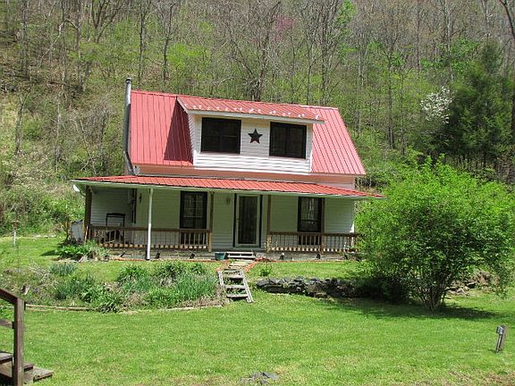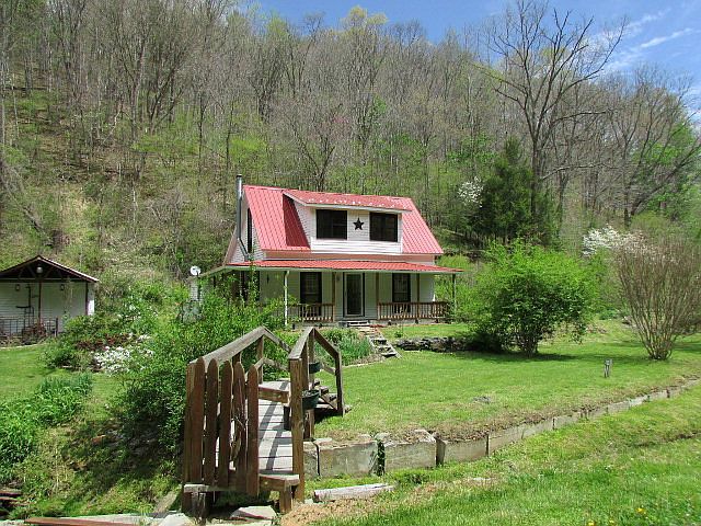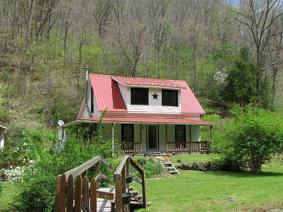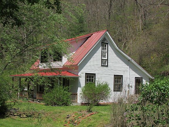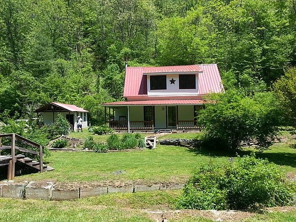 Charming, Older Remodeled Farmhouse on 2.2 wooded acres. Landscaped yard with numerous shrubbery, garden area, 2 apple trees, several walnut trees, pear tree and grape arbor. Main level consists of living room with wood stove, combination dining/kitchen, bath with utility area and bedroom. Upstairs is two bedrooms, storage in attic and attic fan. Covered front and side porch to enjoy sounds of creek and view looking up at mountains. Creek flows through property. Home fronts on paved road.