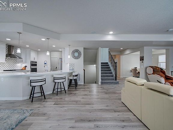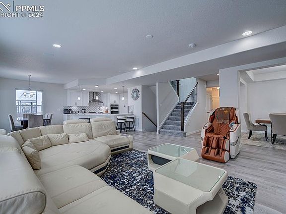 Welcome to this stunning 6-bedroom, 5-bath home in the highly sought-after Highline at Wolf Ranch. Boasting neutral white and gray tones throughout, this spacious residence offers luxury vinyl flooring on the main level, creating a seamless flow through the open-concept design. The gourmet kitchen features quartz countertops, a breakfast bar, stainless steel appliances, a coffee bar, and ample cabinet space. It opens to the dining area, which leads to an expansive deck with breathtaking views—perfect for entertaining. The main level also includes a formal dining room, an expansive living room with a gas fireplace, powder room, an office with built-in bookshelves, and a large mudroom with plenty of storage off the 2-car garage. Upstairs, the primary retreat is a true sanctuary, complete with a spa-like ensuite featuring dual showers and a full length bench seat, as well as a spacious walk-in closet. The upper level also offers 4 additional bedrooms, full bath and a conveniently located laundry room with a sink and cabinets to serve all bedrooms. The finished basement is an entertainer’s dream, with a massive rec room, a full-service wet bar, and an additional bedroom with an ensuite. Outside, the professionally landscaped backyard includes a firepit area, a putting green, stone walkways, and a deck that spans the length of the home—an ideal setting for outdoor gatherings. This home offers luxury and comfort in every detail, making it a must-see in Wolf Ranch!