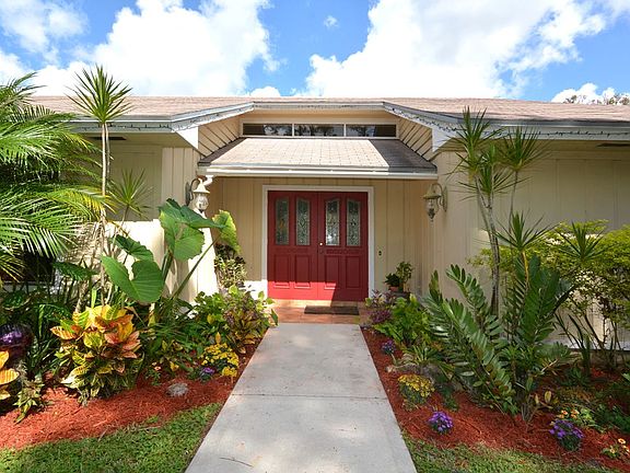 Jupiter Farms gated home in private peaceful setting lined with exotic trees as well as Mango, Papaya, Avocado and Pineapple Fruit trees. Screened pool. Lovely kitchen - den with granite counters and French door leading to patio. Serene fully stocked fish pond with fountain and wood deck. New A/C and Water pump.