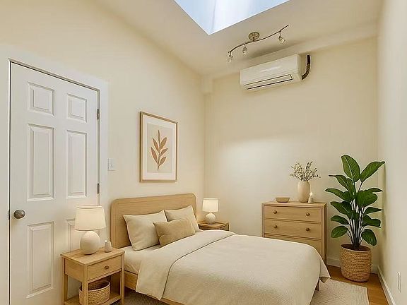 The living room features abundant natural light, complemented by hardwood flooring throughout the residence and stainless steel appliances in the kitchen. Each bedroom benefits from ample illumination, attributable in part to two substantial skylights. Notably, one of the bedrooms offers a separate entrance, which enhancing accessibility.