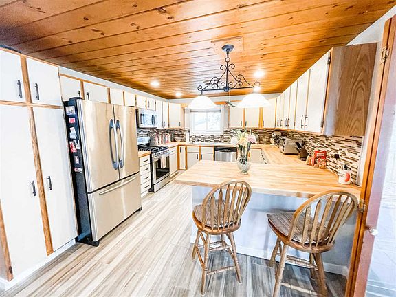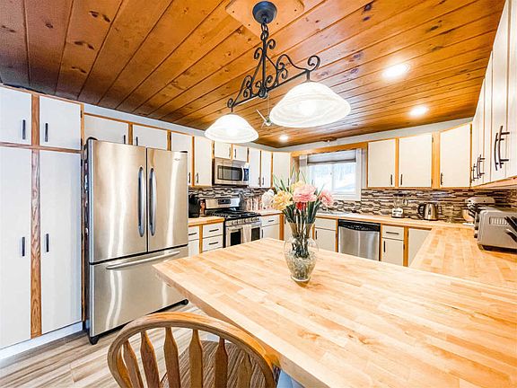 Gilford NH 03249 - Located less than 3 miles from the entrance to Gunstock ski area. This contemporary home is the ideal basecamp for Lakes Region adventures! Featuring 3 bedrooms, 2 baths, a 2 story vaulted ceiling finished in pine in the living room, a modern updated kitchen with butcher block countertops, new appliances and an on trend backsplash, perfect for your home chef! Newly renovated baths and oversized bedrooms with hardwood floors, a beautiful screened in porch which leads out to large decks, and a new lawn and irrigation system. The lower level features a work shop laundry area and bonus den with sliding glass doors to the back yard. This contemporary homestead has a detached 2 car garage with an unfinished one bedroom apartment above! The lot is currently very private but could have wonderful views of Gunstock ski area if trees are removed! Home comes with rights to Gilford Town beach, one of the finest beaches on Lake Winnipesaukee!