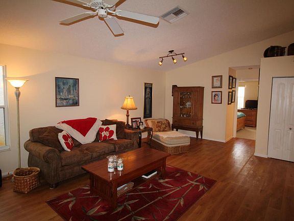 This former model is beautiful and affordable. Relaxing water view as soon as you walk into the spacious Great room of this pampered villa. Situated in the quiet enclave of the Island on the widest part of the lake. The island has it's own pool. Lake view extends from the Great room, Master bedroom, & enclosed patio. Vaulted ceilings throughout, laminate and tile flooring with newer carpeting in the bedrooms. Split bedroom plan, bright Kitchen with Breakfast room, Utility room, & lots of storage space. Large Master bedroom ensuite featuring a roman tub, separate shower, & dual sinks. The third bedroom makes a perfect den or exercise room. Newer dishwasher, newer garage door opener, Accordion shutters. Two car garage & extra long driveway. You will love River Bridge with all it's amenities