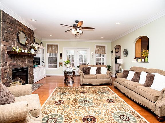 a very private home on 5+ acres that was custom built by one of the best builders in this area! Gourmet kitchen with custom cabinetry along with granite countertops and stainless steel appliances. Dining room with tall arched windows and vaulted ceiling. Large great room with stone gas fireplace and built ins. Hardwood flooring throughout with some tile. Master bedroom has walk-in closet along with a bright and airy bath that has custom cabinetry. Two additional bedrooms with double door closets. Hall bath with granite countertops and double vessel sinks. Main floor Laundry room with built in pantry. Partially finished basement with family room, full bath, office and storage. Walk up stairs to unfinished second floor to expand. Spacious covered deck and open area to cookout and enjoy the views. Extensive landscaping and fenced area for pets to run and play. Detached workshop with attached carport. Whole house generator to convey. This home has lots of storage.