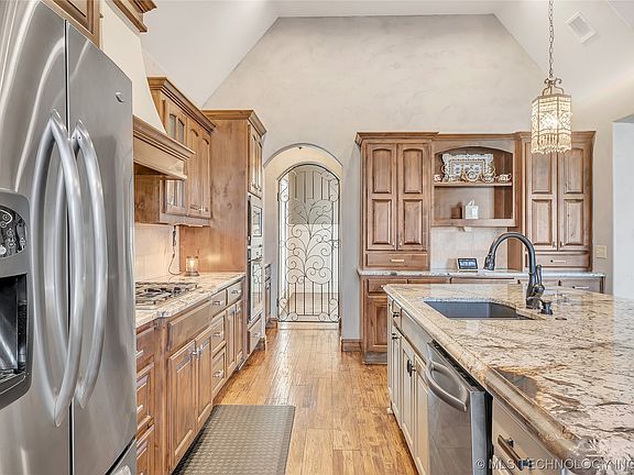 Chisholm Ranch community, located in Bixby. This gorgeous 4 bedroom + office , 3.5 bath home offers an open floorplan. Spacious kitchen offers exposed hand scraped beamed ceilings, large center island featuring granite countertops, mini refrigerator and butlers panty along with a walk in pantry. The luxurious primary bedroom downstairs in addition primary bathroom with walk in shower and soaking tub large walk-in primary closet. Private door to enter into covered patio area. As soon as you walk through the amazing home you will be swept away by the charm and beauty, attention to detail, impressive high ceilings, wrought iron, chandeliers, formal dining room features a custom wine cabinet. Distressed solid wood hand scrapped flooring, travertine tile and custom paint finishes. Media/Game room upstairs offers plenty of space for all types of entertaining, complete with wet bar. Large windows through out the home allowing plenty of natural lighting in. Community pool at end of block. Home backs up to a sheep farm, no neighbors behind. Must see to appreciate home details.