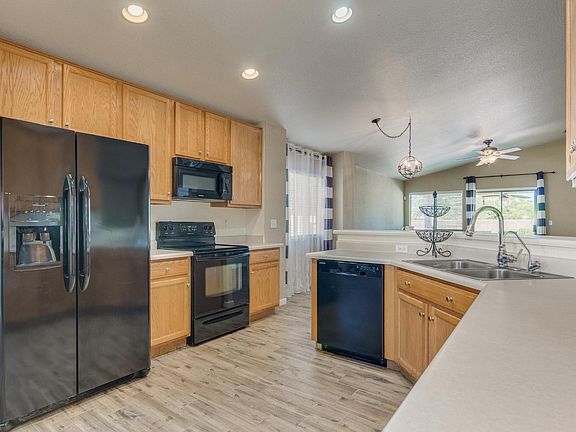 This beautifully maintained Mesquite Ranch home sits on a premium corner lot with no house behind. Enjoy the popular split floor plan with flowing wood-look tile floors, vaulted ceilings, spacious great room with dining area, and ceiling fans throughout. Open concept kitchen features black appliances, built-in microwave, and ample cabinet space. Master features lovely bay window, HIS & HER walk-in closets, large ensuite has double sinks and garden tub. Low care yard is a great canvas for your landscaping dreams to come true! NEW HVAC and Heating system installed 1 year ago. Schedule today to see this great home and community with 2 pools, 3 playgrounds, basketball, volleyball, parks & more. Located in the VAIL School District.