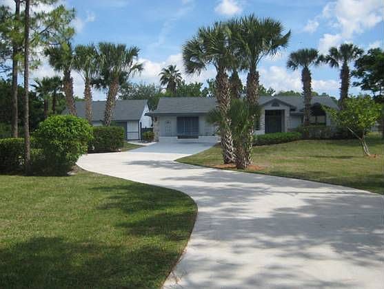 Wonderful home. Stucco with bahama shutters/impact glass as hurricane protection. Detached garage is 1200 sq. feet. Has an awesome workshop/office space/exercise room as well as 3 car parking. RV garage is 800 sq feet and can park your motor home/boat/etc. New roof in 2004 with 50 year shingles. New prior to hurricanes. House was painted outside in 2006. Concrete circular drive. 1.25 acres. Separate living and family rooms. Fireplace is cocquina rock. Beautiful. Wood-burning. Flooring is wood, tile and some carpet. New carpet in 2006. Beautifully landscaped. Neighborhood Description This is an equestrian community. People ride their horses. There are a number of dirt roads for the horses but I live in a paved road. Every year there is a Christmas parade and it goes right in front of my house. We sit out in our lawn chairs and watch the horses/floats/etc. go by. Remember, in Florida in December, we are still wearing shorts! Lots of people have large animals here as well as beautiful gardens. Anything will grow here.
