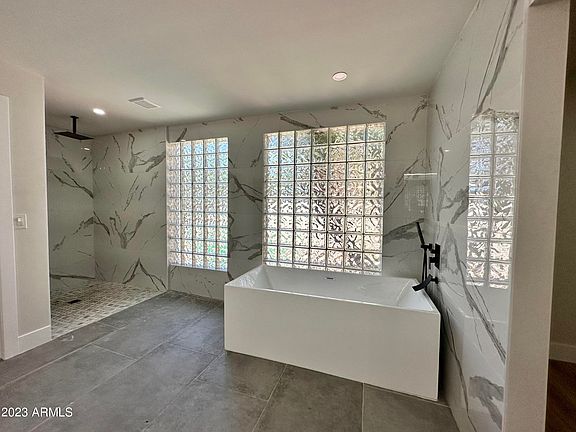 Welcome to this thoughtfully designed open floor plan home, a luxurious oasis nestled in the heart of Scottsdale, Arizona. This stunning 4-bedroom, 3.5-bathroom home has undergone extensive upgrades, boasting an exquisite blend of modern design and timeless elegance. As you step inside, you'll be greeted by the allure of wide plank vinyl flooring and porcelain tile adorning the entirety of the main floor. The 16-foot vaulted ceilings create an atmosphere of grandeur, enhancing the spaciousness and allowing natural light to cascade throughout the home. Indulge your culinary desires in the custom kitchen, a masterpiece designed for both functionality and beauty. Adorned with marble countertops and complemented by a striking granite backsplash, this kitchen is a chef's dream.(click to cont) The large breakfast bar offers ample seating, perfect for entertaining friends and loved ones.