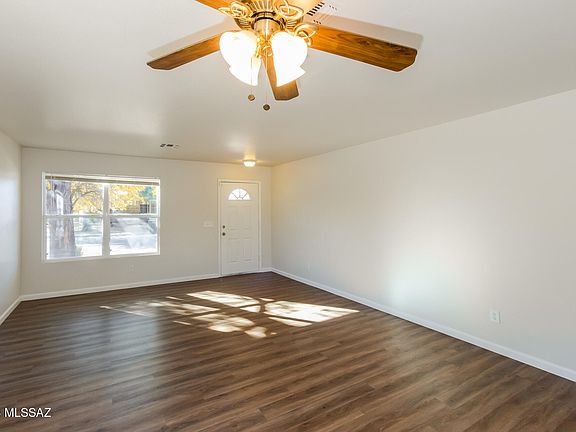 Step into this thoughtfully designed home featuring an open floorplan where the kitchen seamlessly overlooks the living room, creating a welcoming space for gatherings and everyday living. Enjoy sleek vinyl flooring throughout the living areas and hallways, paired with carpet in the bedrooms for a cozy touch. Each bedroom is equipped with a ceiling fan, ensuring comfort in every season. The spacious backyard offers endless opportunities to relax, play, or entertain under the Tucson sun.