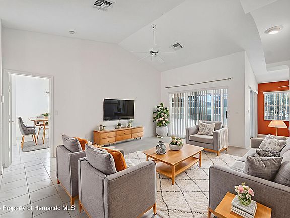 This beautifully maintained 3-bedroom, 2-bathroom home with a 2-car garage features a roof that's only 3 years old and a central heat/air system under 5 years old—offering peace of mind right from the start. Freshly painted on the exterior and in both bathrooms, this home welcomes you with an extra-wide, covered walkway leading to a double door entry. Inside, you'll find a spacious living and dining room, where tiled walkways complement the cozy carpeted areas. Sliding glass doors from both the living room and breakfast nook open to a large enclosed sunroom, perfect for year-round enjoyment. The kitchen is thoughtfully designed with stainless steel appliances, a built-in oven and range, a walk-in pantry, and a generous breakfast nook that easily fits a full table. Just beyond, the family room impresses with soaring cathedral ceilings, a gas-burning fireplace framed by built-in window seats, and warm natural light. This split floor plan places the primary suite on one side of the home, featuring tile flooring, sliding doors to the sunroom, dual closets (including a walk-in), and an ensuite bath with a double vanity, jetted (jacuzzi-style) tub, and a walk-in shower. On the opposite side, the two additional bedrooms each offer walk-in closets and share a spacious second bathroom with bold black-and-white tile and ample storage. A central laundry room with built-in cabinetry and a sink adds to the home's functionality. The expansive sunroom has windows lining three walls and can be used as a playroom, hobby space, or additional living area. Outdoors, enjoy your own backyard orchard with mature fruit trees including lemon, three loquats, orange, peach, and even a grapevine—an enticing feature for both locals and out-of-state buyers looking to embrace Florida's lifestyle. Conveniently located right in the heart of Spring Hill just 6.5 miles from the Suncoast Expressway, this home offers easy access for commuters heading to Tampa or nearby areas. Local attractions include Weeki Wachee Springs State Park (5.5 miles), Pine Island Beach (12.8 miles), and Nature Coast Botanical Gardens (3.5 miles), making this home the perfect balance of comfort, space, and connection to nature.
