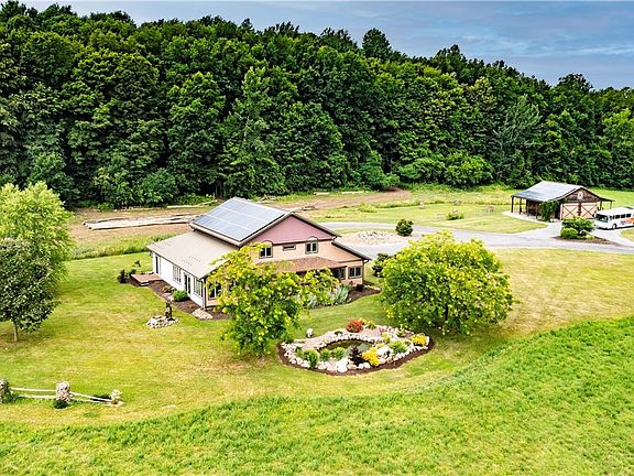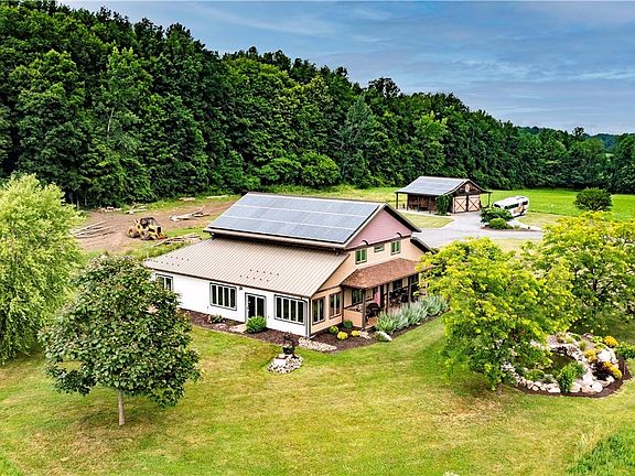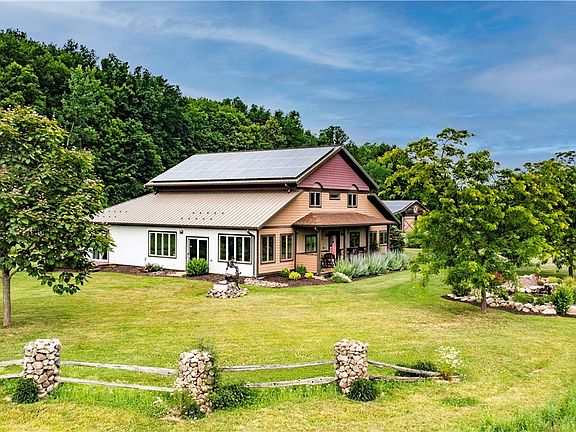 PRICE REDUCED $301,000. UNIQUE AND SECLUDED 101 ACRE ESTATE W/ABOUT 5600 SQ-FT OF LIVING SPACE BETWEEN MAIN HOME AND CARRIAGE HOUSE. ECLECTIC FARMHOUSE DESIGN. DETACHED 36X24 BARN W/10X10 BARN DOORS. MAIN HOME W/CUSTOM FINISHES, NATURAL WOODWORK, POST & BEAM, CUSTOM CABINETS, WINDOWS, SOLID WOOD DOORS, EXPANSIVE KITCHEN, LIGHTING, EMTEK HARDWARE, AMBROSIA MAPLE & CORK FLOORS, AND TASTEFUL FIXTURES THROUGHOUT. CARRIAGE HOUSE IS A 2 STORY WITH 1-2 BEDROOM AREAS, EAT-IN, LIVING AREA/LOFT, HALF, FULL BATHS AND 1+ GARAGES. POSSIBLE IN-LAW, OR AIR -BNB. LOW OR NO ENERGY COSTS WITH SOLAR PANELS ON MAIN HOME AND BARN THAT SERVE THE PROPERTY. SIT ON THE 30X6 FRONT PORCH AND SEE THE BEAUTIFUL VIEW. 80+ ACRES OF WOODED LAND WITH MANY TYPES OF TREES. MANY WALKING PATHS, STREAM, AND DRUMLIN ON PROPERTY. HEATING AND COOLING WITH FUJITSU MINI SPLITS IN MAIN HOME/ CARRRIAGE HOUSE & RADIANT HEAT. CUSTOM KITCHEN OPENS TO LARGE GREAT ROOM WITH LIVING, DINING AREAS W/LARGE ADJACENT SUNROOM W/MANY WINDOWS, SLIDERS, AND NATURAL LIGHT. 1FL HAS MASTER, BR/OFFICE, AND 2FL HAS 2BR+ AREAS. OPEN FLOOR PLAN. ATTACHED GARAGE ON HOME, AND 3-4 SPACES IN MAIN BARN. POSSIBLE SELLER FINANCING.