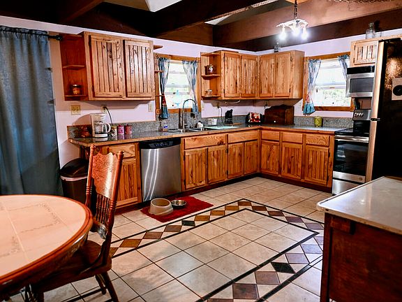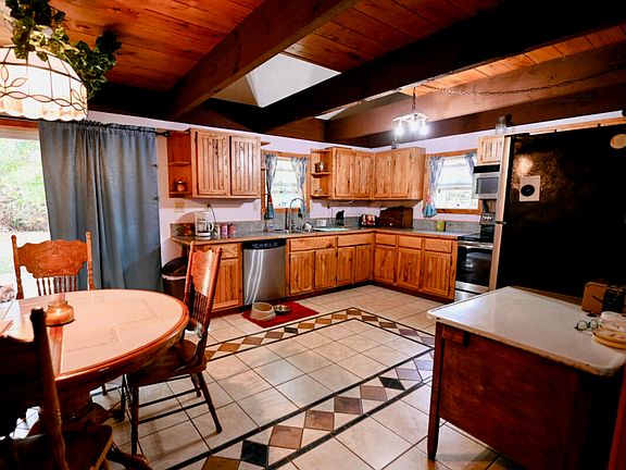 Spacious 3-4 bedroom, 2 full bath home offering over 1700 sq. ft. of living space on 2.3 acres. Interior features include ceramic and wood flooring, custom-built kitchen cabinets, and fresh interior paint in progress. A new steel roof was installed in 2025 for added value and peace of mind. This property is equipped with area for pellet stove, providing efficient heating options throughout the home. There is a 12' x 16' new deck. In addition to the main residence, the property includes a 5000+ sq. ft. aluminum building offering ample space for business use, storage, or a variety of other purposes. An additional stone outbuilding houses a wood burning furnace should you desire Hydronic Heating. This adds even more heating flexibility and functional space. Property offers both comfortable living and excellent potential for work, storage or hobby use. Home entry is coded. You will need to call to get code. SentriLock is on barn door with key to lock. No power inside barn, so will need a flashlight when showing.