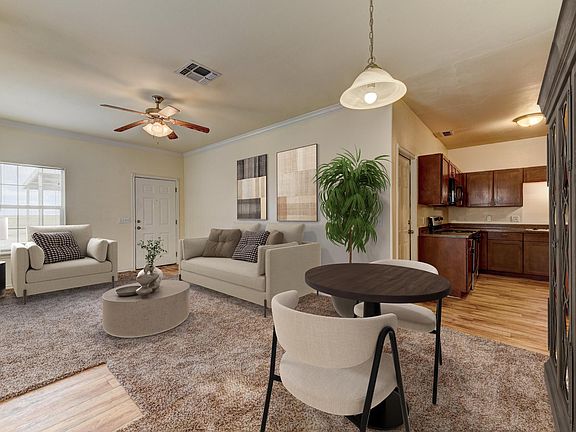 Interior: Pre-wired for telephone, cable and internet Whirlpool Energy Star stainless steel appliances including range, dishwasher, refrigerator, and microwave vent unit Designer cabinets and tops Carpeted living areas Walk-in closets 9-foot ceilings TWO full baths Ceiling fans Miniblinds Crown molding Exterior: Carport & garage w/remote Lawn maintenance provided Fenced Backyard Paved streets & sidewalks Designer Street Lights Community Pool Renter is responsible for utilities, No smoking allowed, Large pets are welcome, Stainless Appliances in some of the units.