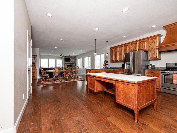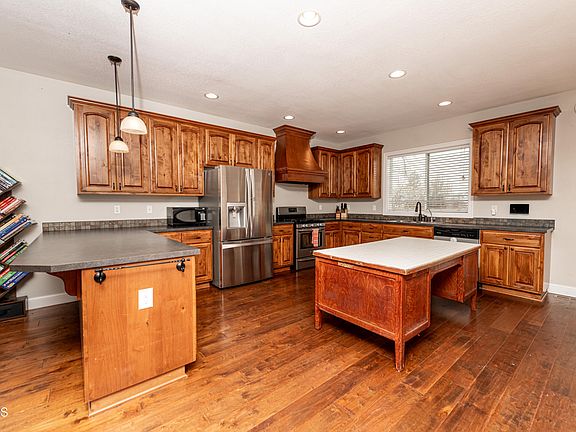 This stunning residence, situated in the heart of downtown, showcases an abundance of natural light and boasts a prime hilltop location, offering breathtaking views clear to the Rough Rider Center. The beautiful stone fireplace creates a warm and inviting ambiance, perfect for cozy winter evenings at home. With ample space for large gatherings, this property is ideal for entertaining. The kitchen is a culinary dream featuring a unique, antique desk transformed into a kitchen island, adding a touch of Watford City's history. The large back yard is lined with mature trees that conveniently backs onto an alleyway. The primary bathroom is complete with a jetted tub, tiled shower, and dual vanities.