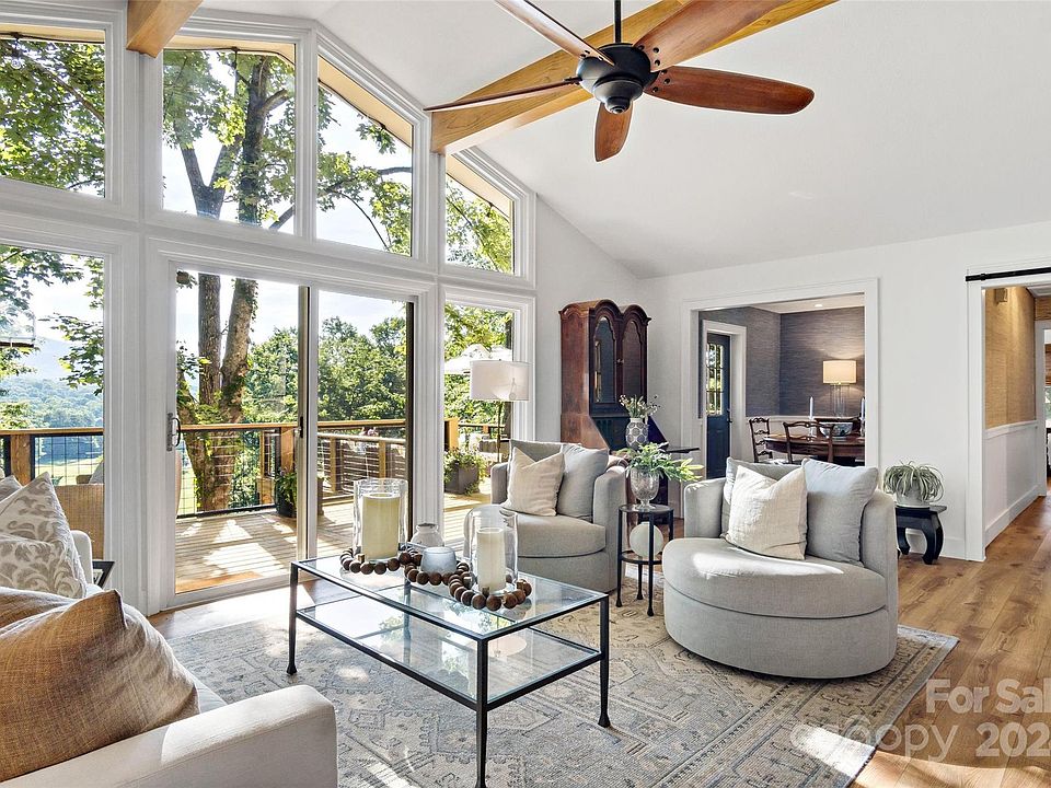 Perched in the majestic Blue Ridge Mountains, this custom renovation retreat offers a sanctuary of elegance and serenity, with due east sunrise over the mountains on the 8th hole of the Black Mountain Golf Course. Designed with discerning taste, this residence showcases bespoke features at every turn, from handcrafted tree railings to intricate detailing. The entrance sets the tone for luxurious living. The gourmet kitchen, with top-of-the-line appliances and exquisite countertops, invites culinary exploration and gatherings, offering mountain views and unforgettable sunrises. This home includes an expansive lower-level apartment with a private entrance, kitchenette, bedroom, bath, and living space—ideal for guests or multigenerational living. A tranquil sitting room offers a quiet retreat. Step outside onto the sprawling deck, where breathtaking views of the golf course and mountains create unparalleled beauty. Just 30 minutes from Asheville Airport, a generator is also included.