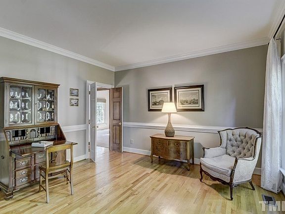 Gorgeous Brick front home on nearly 1 acre in prime Cary location. Hardwoods throughout most of 1st flr. Extensive millwork. Kitchen has s/s apps & tile b-splash. 1st flr guest suite (could be master suite). 2nd flr master offers completely updated bathrm w/granite top dual vanity, whirlpool tub & separate tile shower + walk in closet. Large bonus rm w/ separate back stairs. Features include pella windows/door, leaf guard gutters, intercom system & more! Huge w/u attic. Oversized finished 2 car gar.