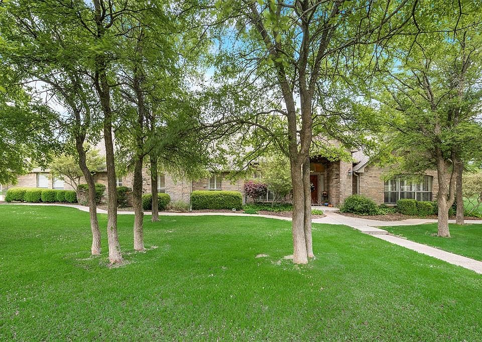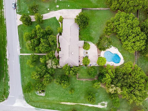 Beautiful home on almost 3 acres in Arapahoe Ridge subdivision, wonderful mature oak and elm trees on the property, large patio space for entertainment with large in-ground pool, oversized driveway, spacious entry that opens to a large living room with high vaulted ceiling, open concept flow from kitchen, living, and two dining areas, spacious master suite with 2 closets, 3 bedrooms in one wing of the home with shared bathroom, one bedroom with en suite, plantation shutters, corian counter tops in the kitchen with breakfast bar seating 3