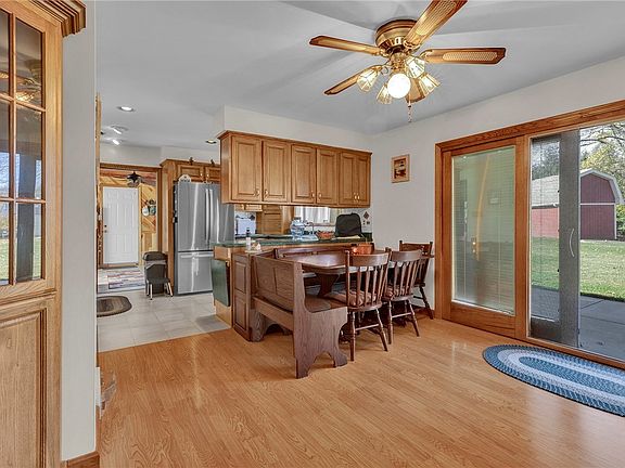 The kitchen has stainless appliances, wood cabinets, and great counter space. The open kitchen extends to the breakfast area and patio doors lead to the yard.