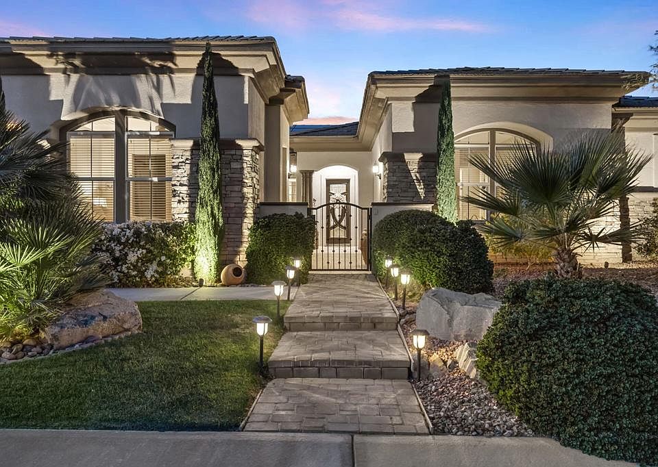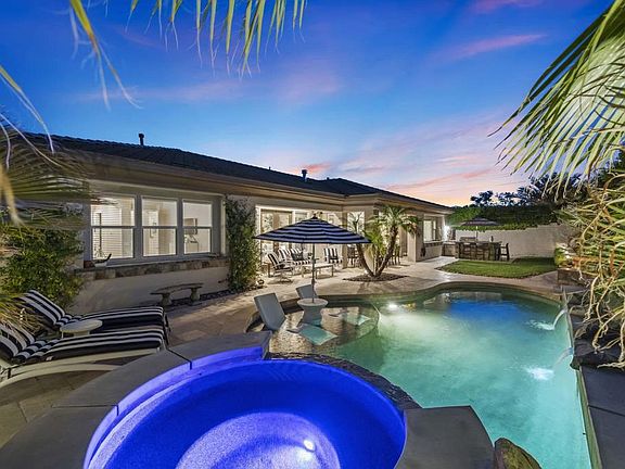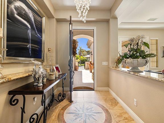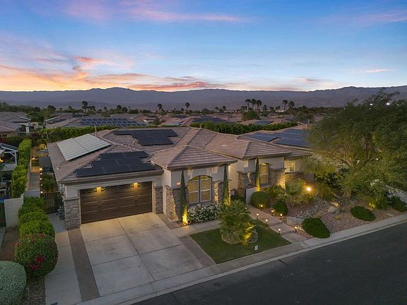 BRENNA AT CAPRI: 5BR WITH CASITA!! Experience Palm Desert luxury living with a resort-style backyard featuring a sparkling pool, spa, fire pit, and an expansive wraparound BBQ bar--perfect for seamless indoor-outdoor entertaining. Inside, the open-concept layout offers a chef's dream kitchen with elegant natural stone countertops, high-end Thermador and Miele appliances, a center island, pantry, and breakfast bar.The great room boasts soaring ceilings, built-in surround sound, a media niche, and a striking double-sided stone fireplace that connects to the formal living room. The primary suite is a private retreat with a sitting area, dual walk-in closets, jetted tub, custom stone shower, and dual vanities.Ideal for guests or a private workspace, the detached casita features a spacious bedroom, full bath, and large closet. Two additional guest rooms are connected by a stylish Jack-and-Jill bath. A fifth bedroom makes a perfect office space. Leased solar helps manage energy costs. The ultimate in desert lifestyle awaits!