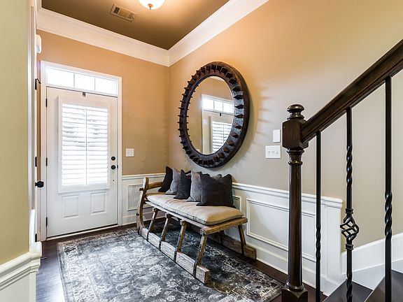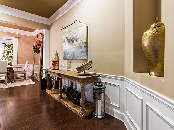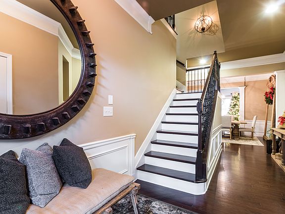 This open floor plan has all the builder upgrades plus many more. The dark hardwoods grace the both levels (no carpet) with 10ft ceilings and crown molding added throughout. The kitchen is open to the dining room, breakfast room and living room which has a coffered ceiling and a fireplace enveloped with custom built-in, lighted cabinets. The chef's gourmet kitchen has 5 burner gas cook top, upgraded, stained cabinetry, and amazing island with breakfast bar, stainless appliances, and granite. Up The oversize master bedroom has a sitting room and a private porch.