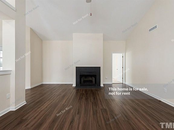 This Cary one-story home offers a fireplace, vaulted ceilings, a walk-in closet in the master bedroom, and a covered patio.