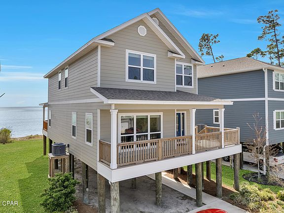 This home is particularly special as it's one of only five houses on the street to offer the Bradford Floor Plan. This design thoughtfully incorporates water views from several key rooms - the Primary bedroom, kitchen, breakfast area, and family room. Moreover, it features an expansive back deck that spans the entire width of the house, providing ample space for outdoor enjoyment observing the lively interactions on the water, including recreational boats, playful dolphins, and diverse sea birds. The distant air traffic from Tyndall Air Force Base adds a thrilling dimension to the serene waterfront setting.