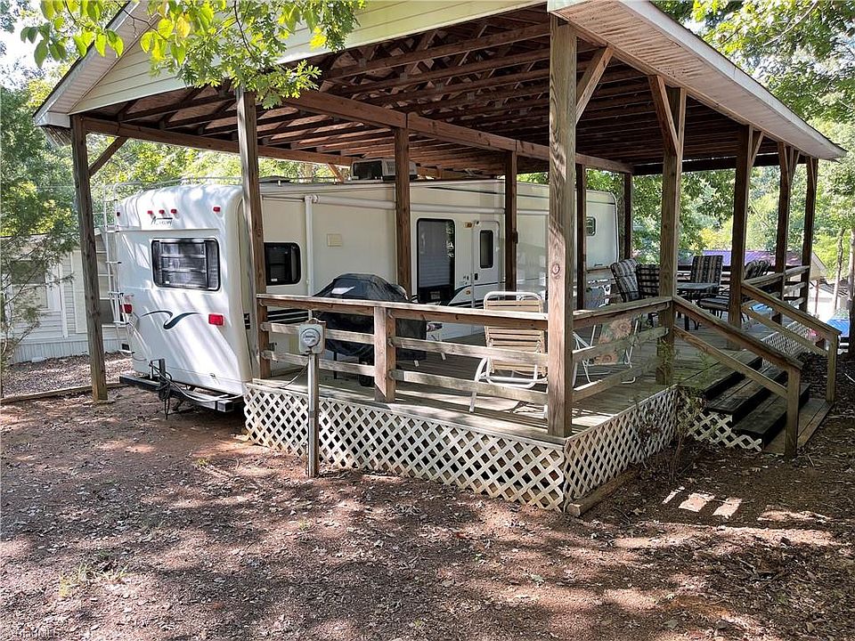 NEW PRICE! Enjoy Lake Tillery lifestyle without breaking the bank! 34' Holiday Rambler Alumascape Fifth Wheel crafted for long-lasting durability, stored safely under shelter throughout its life. Maintained by a single-family owner, this RV has minimal usage and remains spotlessly clean. On a shaded, paved, cul-de-sac lot walking distance to the swim beach. Covered deck runs entire length of home so ample space for social gatherings. Two slide outs and five cargo bays for storage. Accommodates up to 6 people with a sofa and dinette that can be converted into beds. Rear kitchen with dual sinks and genuine oak cabinets. Bathroom has glass shower enclosure and wardrobe/linen storage. Queen-sized bed, spacious closet, built-in desk. RV comes fully furnished, ensuring a hassle-free move-in experience. Electric heat/AC with auxiliary propane. Activities & amenities include pool, beach, horseshoe pits, playgrounds, variety store, tennis, basketball & more. Real estate agent required to access