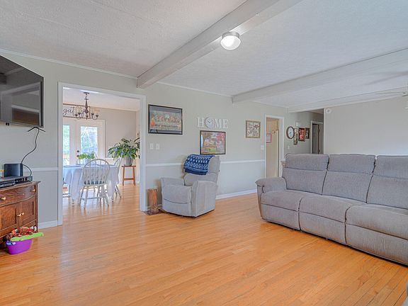 We all know first impressions matter & this one will have you saying, Honey, STOP THE CAR! Effortlessly flowing layout with each room feeling distinct is exactly what you will get along with tons of natural light, hardwood flrs, NEW carpet, soothing paint, exposed beams, plus great deck, garage & convenient location! Spacious living rm w/brick fireplace & sun-kissed dining rm to entertain! Start making meals & memories in a kitchen with cabinet & counterspace galore, plus cut out to dining so you are never separated. 3 bedrooms w/lovely full bath. Primary features exposed beams & walkin closet. Lower level family rm, bath & laundry. Fantastic deck overlooks level, fenced yard ideal for BBQs, gardening or just watching fido run. Move-in ready with comfort & conveniences you are looking for!
