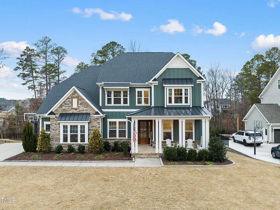 This house checks all the boxes! Surrounded by wooded views on a cul-de-sac, this home truly has something for everyone. Enjoy beautiful sunrises on the large covered front porch. As you enter the home, you'll find beautiful hardwood floors throughout the first level. After walking past the office and dining room flanked with wainscoting and upgraded lighting, you'll notice the designer painted doors which can be found throughout the home. The kitchen and family room are an open floor plan with beautiful, wooded views. The family room has a tray ceiling and a gas log fireplace.The kitchen has quartz countertops and upgraded tile that expands into the butler's pantry as well. Enjoy meals on the screened in porch, and additional expanded deck provides convenience for grilling. Beyond the kitchen and family room is a drop zone with storage. Finally, the first floor offers a guest suite with walk in shower.  As you enter the second floor, you'll notice expanded wooded views from every room. There is a large open loft and 4 additional bedrooms including the Master suite.The laundry room is conveniently located on the second floor. A jack and jill bathroom with separate vanities connects two of the bedrooms.The master bedroom has a tray ceiling and leads to a gorgeous master bath. Separate his and hers closets border a bathroom with upgraded tile, soaking tub, and steam shower.  The basement of this home offers the 6th bedroom and full bath providing options for a teen suite or multigenerational living.  Additionally, you will find over 500sf of climate controlled storage. As you exit the basement, you'll find a covered patio with gorgeous wooded views.  Through the woods, it is a short hike to Harris Lake! The yard has been measured and scoped for pool installation and design plans will convey with the sale of the home. There is an adjustable basketball goal that also conveys with the sale of the home.Invisible fence is installed in C formation throughout the property and offering protection of flower beds and will convey with sale of home.  Finally, there is a community pool at the entrance to the neighborhood.