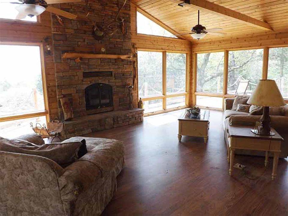 Bull Shoals Lake Home with Boat Slip. Great RM features Floor to Ceiling Stone Fireplace & Large Windows Offer Gorgeous Lake Views. Abundance of Cabinets & Corian Countertops in KT. 2 BR, 2 Full Baths, Walk Out Basement, Wraparound Decks, Year Round Views, Double Garage, Potting Shed & Open Equipment Shop. Boarders Gov. Strip and includes 1 Stall in Private Boat Dock.