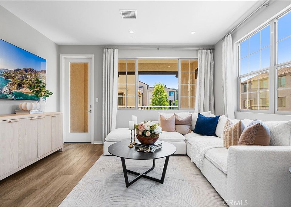 Welcome to this stunning former model home in the highly desirable community of Cypress Village. Beautifully designed, this tri-level condo, with paid-off solar, enjoys a desirable corner location next to the park, with serene park views from the kitchen and dining room. As a formal model home, it showcases designer upgrades throughout, from elegant flooring and custom finishes to a thoughtfully curated color palette that enhances its modern charm. The bright and airy main living space features an open-concept layout, highlighted by a gourmet kitchen with quartz countertops, sleek cabinetry, and stainless steel appliances. The adjoining dining and living areas create the perfect setting for both entertaining and everyday living. Upstairs, the spacious primary suite includes a spa-like bathroom with dual sinks and a generous walk-in closet, while the secondary bedroom is ideal for family, guests, or a home office. Located just steps away from Cypress Village’s resort-style amenities—sparkling pools, parks, playgrounds, and scenic trails—this home also offers unmatched convenience with top-rated Irvine schools, shopping, dining, and freeway access all nearby. Combining modern style, comfort, and prime location, this beautiful home presents a rare opportunity to own a move-in-ready home in one of Irvine’s most sought-after communities.