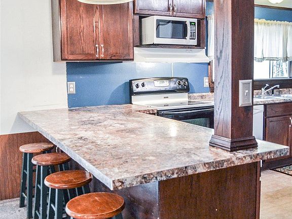 - Kitchen: Bar, Counter Tops-Formica, Eat In, Cabinets-Stained, Floors-Vinyl