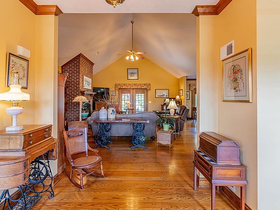 This beautiful custom brick ranch with 5 acres offers country living at its finest. You’ll love the hickory kitchen cabinets, red oak flooring throughout, and second floor bonus room over the large two car garage. The primary suite with its updated bathroom and walk-in closet offers privacy away from the additional bedrooms and bath. The current owners have taken great care of their home by investing in updates such as commercial guttering, a Trane dual fuel heating/cooling system, a new well pump, a radon abatement system, new garage doors/openers, kitchen appliances, and a whole house generator. These upgrades ensure that the home is not only well-maintained but also equipped with modern amenities for comfort and safety. The full basement with its grand double door outside access, offers heating and air, plumbing rough-in and a firebox to add an additional fireplace. Having your own space in a detached one-car garage away from the main house can offer a peaceful and private space for work or relaxation. Come explore the gardens, fruit trees, stone fire pit, and gazebo with mountain views.