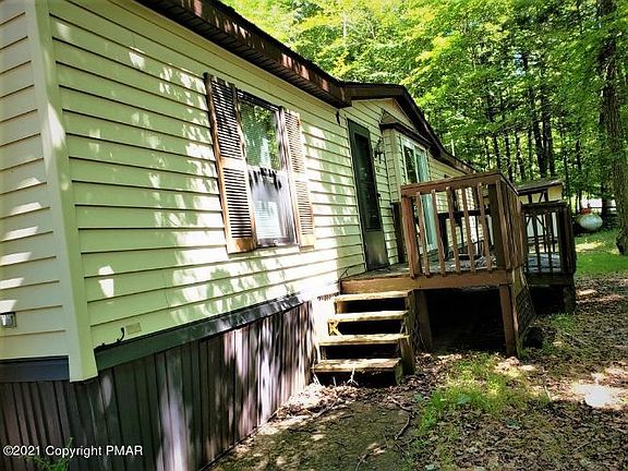 Large and Affordable! Located in private community, The Escape, this 1, 576sqft Double-Wide Mobile Home offers open and airy floor plan with 3 bedrooms, 2 full bathrooms and 1 half bath, generously sized living room and separate family room with double sided propane fireplace into the dining area. Kitchen with skylights is just off of the laundry room. Master bedroom with full bath suite and large walk in closet! Beautiful outdoor space with a large shed. HOA Dues include central sewer, central water, 2 outdoor pools, clubhouse and boat launch to Wallenpaupack. PROPERTRY IS STRICTLY BEING SOLD AS-IS.