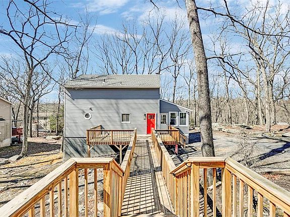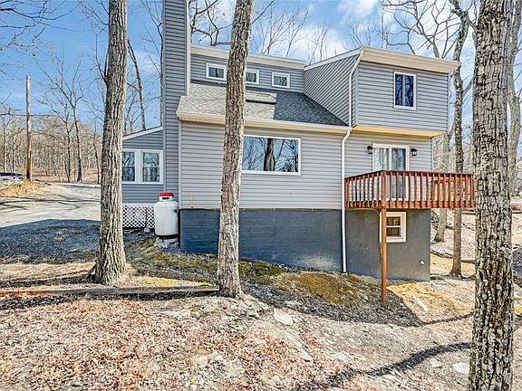 Immaculate Pocono Contemporary Set In Peaceful Cul-De-Sac Location Of Amenity Filled Vacation Community! 3 Bedroom, 2 Full Bath Sun-Kissed Floor Plan Offers Living Room w/ Brick-Faced Wood-Burning Fireplace & Beautiful Picture Window Showcasing Delightful Countryside View. Many Upgrades Throughout Include 3 Season Room, New Kitchen Counters, Backsplash & Appliances Along w/ Finished Walk-Out Basement Featuring Kitchenette & Large Family Style Rec. Room For Potential Guest Or In-Law Quarters. Spacious 1st Floor Primary Bedroom Features Private Balcony & Access To Full Bath w/ Jacuzzi Tub. 2nd Floor Offers 2 Bedrooms w/ Full Bath & Bonus Loft w/ Custom Woodwork, Vaulted Ceilings & Abundant Natural Lighting. Custom Exterior Storage Feature Along w/ Utility Storage Room Plus Expansive Front Deck w/ Cat Walk Leading To Parking Area. Multiple Heat Sources Throughout Include Efficient Blue Flame Propane Heaters, New Pellet Stove (2021), New Vinyl Siding & Gutters (2023), New Grinder Pump (2021) Plus Newer Roof & Windows. Desirable Public Water & Sewer. Gated Vacation Community Offering Private Restaurant, Ski Slope, Lakes, Beach, Pools, Indoor & Outdoor Sporting Courts, Fitness Center, Entertainment Schedule & More!