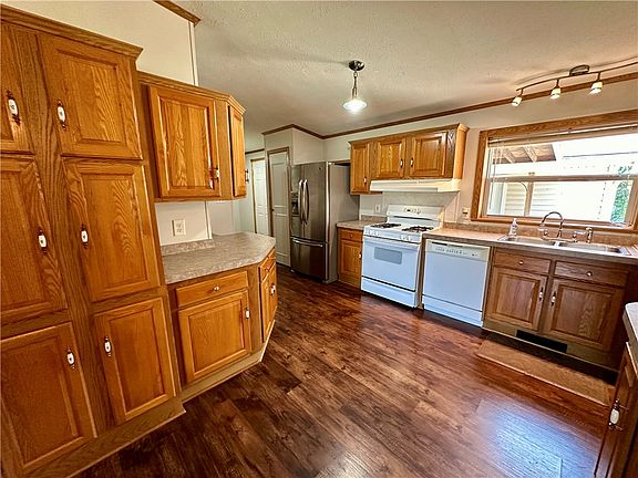 Welcome to Toledo! This charming 3 bedroom, 2 bath manufactured ranch home, built in 2001, offers a comfortable and convenient lifestyle just walking distance from downtown Toledo! Inside, you'll find spacious bedrooms and two full bathrooms, one featuring a walk-in shower. The open layout is enhanced by laminate flooring throughout, creating a seamless flow from room to room. The kitchen boasts oak cabinetry, white appliances and a stainless steel refrigerator, while the nice sized dining room extends to a beautiful sunroom. Step outside to a fully fenced backyard complete with a shed, and enjoy the convenience of a detached 4 car garage. This home is maintenance free living in an ideal location! Call today to schedule your showing!