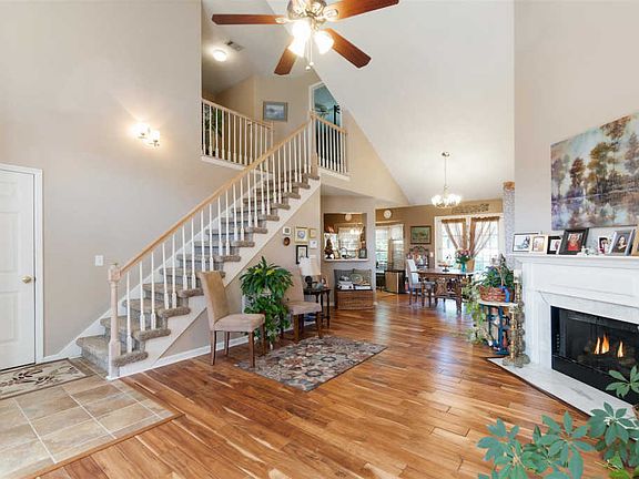 OPEN HOUSE 10/21 2P4P! Charming home with an open floor plan and cathedral ceilings. Fall in love with the Teak wood flooring, gas fp, walk in closets, xl patio, large bonus room, ceiling fans, all on a larger fenced lot! Includes new windows, roof, hvac, and water heater. Community pool. Minutes to hospital, shopping, and highway.