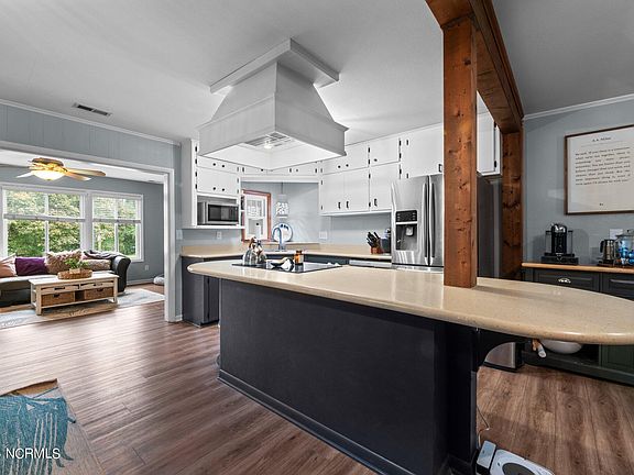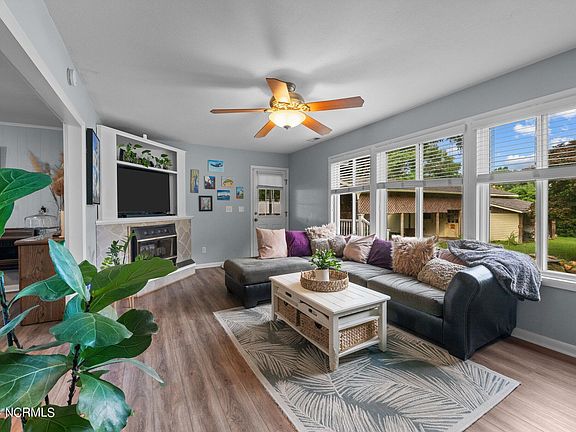 Welcome to this charming 3-bedroom, 2-bathroom home in Havelock! From the inviting front porch, perfect for relaxing in rocking chairs, enter inside to find an open floor plan filled with natural light. The home boasts two spacious living rooms, one featuring a cozy fireplace—ideal for entertaining. The kitchen is a chef's dream with a large island, ample counter and cabinet space, stainless steel appliances, and a dining area nearby. The primary bedroom offers plenty of space with dual vanity sinks, a walk-in shower, and a massive walk-in closet. Two additional guest bedrooms and a full bathroom complete the interior. Outside, enjoy the screened porch and patio, overlooking a fenced-in backyard, perfect for outdoor living. Conveniently located just minutes from MCAS Cherry Point and a short drive to North Carolina's beautiful Crystal Coast beaches!