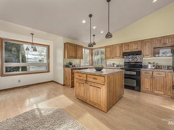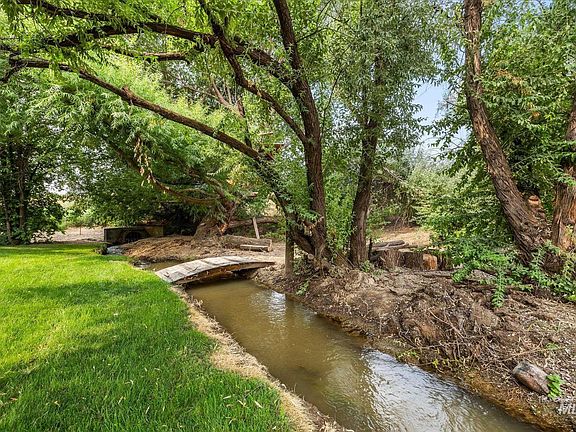 Rustic Charm Meets Modern Comfort. Escape city life & embrace the serenity of small-town living in this stunning Parma retreat. Tucked into a quiet cul-de-sac, this home combines rustic charm with modern elegance. The spacious kitchen, adorned with real wood cabinetry & large island, features a double oven, & easy access to an expansive elevated deck with Owyhee Mountain views. The open-concept layout boasts vaulted ceilings, a striking rock gas fireplace, & thoughtful built-ins, including a desk & shelving for added versatility. The master suite offers a true retreat with a custom tiled walk-in shower, a separate soaker tub, and a spacious walk-in closet. Outside, discover a secluded oasis with mature shade trees, a year-round creek, a decorative waterfall, & a charming walking bridge. Enjoy the firepit & dedicated garden space with raised planter boxes. An oversized two-car garage with workbench & under-house storage completes this unique home, where rustic charm & modern comfort beautifully unite.