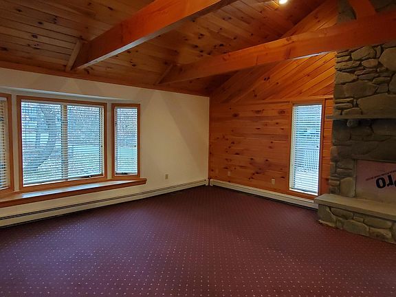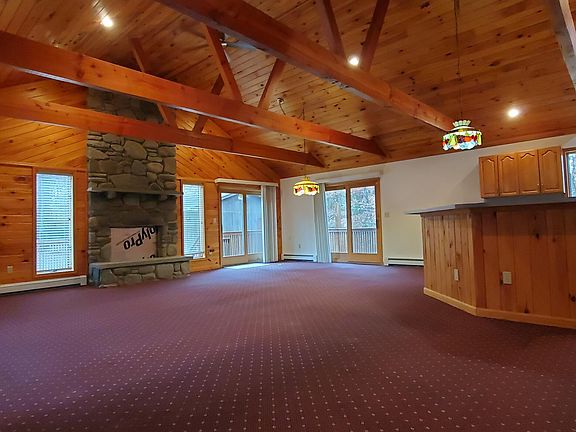 Exceptional Setting 2.25 Acres Bordering 2900+Acres of State Land. Custom Architecture throughout this cedar-sided ranch home w/ over the top Great Room w/ exposed beams and floor to ceiling stone fireplace. Lovely Kitchen w/ center island and Dining Area all flow together in this TOTALLY OPEN FLOOR PLAN! HUGE Master Suite w/ WIC and private bathroom suite. There is a second bedroom and a second full bathroom. Full unfinished basement, economical HWBB Heat, Central A/C & Auto Transfer Generator. Detached 2 car garage, Circular Driveway and all the nature you could ask for! This Estate Sale Opportunity is being sold as-is.