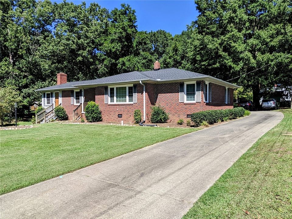 Solid 1700+ square foot brick home w/ 2 BR/1BA. 3rd bedroom was turned into the laundry room. Kitchen w/ stove & microwave. Space for dishwasher. Den w/ fireplace that has wood stove insert & built-in bookshelves. Large dining room. Cozy sunroom on back. Partial basement. Home sits on almost a private acre at the dead-end of Graham St. Concrete drive. New architectural shingle roof just installed 8/22. Vinyl wrapped for no exterior maintenance. Hardwood floors under carpet except for small space in the den in front of the fp. Beautiful shade trees. Manicured lawn. Refrigerator does not stay.
