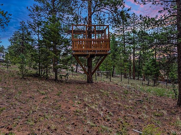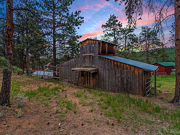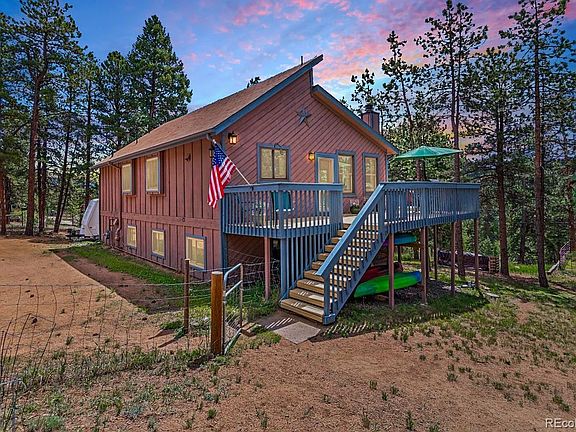 Mountain Equestrian Delight! True horse property, private, fully fenced, corral, barn with two stalls and hay loft; all tucked into a quiet cul-de-sac street in Woodside Park which provides access to trails and close to Staunton State Park for even more riding, hiking and adventure. Two acres of usable land, for the quaint hobby farm with garden space and chicken coop. Outdoor living with large deck, gives you a view of your entire lot. Walk into the main living space with open, vaulted ceilings, large windows, dining and charming kitchen. Upstairs hosts a single bedroom, bath and another bedroom which can be used as a master suite. Downstairs has more living space wrapped around a cozy fireplace, walk-out access, bedroom which is easily used as a media room. Plus, what is currently a detached master quarters, with large walk in closet, full bath and walk out access to the covered hot tub that boasts total relaxation and privacy. Tons of storage, 3 car detached garage, RV parking and pull through driveway make this property functional for all the toys! Bring them all!