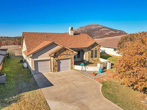 Absolutely beautiful home with amazing views of Wichita Mountains is "in like new home" condition. Located in one of the most prestigious additions, walking distance to Wildlife Refuge for hiking & biking, fishing, and downtown historic Medicine Park, minutes away from Lawton & Ft. Sill. Gated, fenced in courtyard. Step into formal entry, separate formal living or dining room. Dual gas fireplace with large living area, amazing views of mountains & nature scenery through wide, big walls of windows from living & main bedroom. Great open kitchen, breakfast bar, beautiful custom cabinets, large dining area. Secluded large primary bedroom with gorgeous views, luxury bath, separate his & her vanities, large walk-in shower, 2 walk-in closets. Additional two bedrooms with full bath. Beautifuly landscaped yard, big covered patio to enjoy breathtaking views of nature, and so much more.