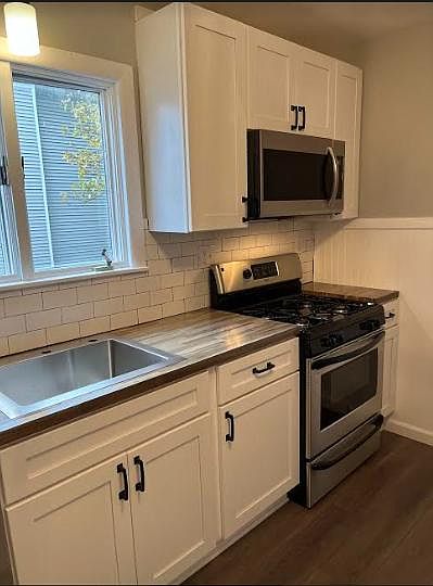 Beautifully refinished hardwood floors, freshly painted, with updates throughout bedrooms, brand new kitchen and bathroom. Stainless steel appliances included with an in-kitchen breakfast bar. Basement laundry hook ups and storage areas available. Water, trash and sewer provided by owner. Gas and electric are the tenant's responsibility. Absolutely no smoking inside. No pets. Driveway and street parking.