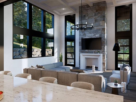 An inviting solarium-like family room awaits, enclosed by three walls of windows and crowned with a coffered ceiling. It offers a tranquil retreat, seamlessly connecting to an outdoor room with a cozy double fireplace. Here, you can enjoy the soothing sounds of a yearlong creek flowing along the southern edge of the property while immersing yourself in the awe-inspiring natural landscape.
