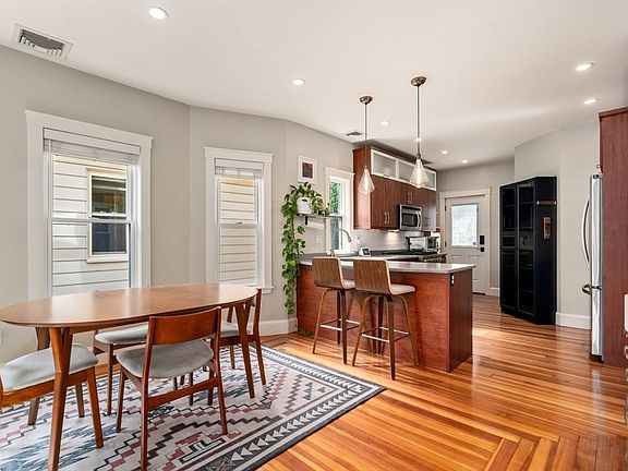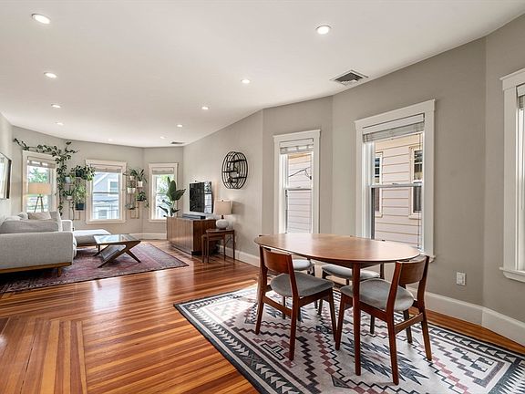 Spacious 3 Bed/2.5 Bath duplex, with study, two exclusive outdoor spaces and parking(1), located between Spring Hill and Magoun Sq. The first floor has a large open kitchen and living room, with high loft like ceilings and ample windows, allowing a generous amount of natural light. The kitchen is modern with updated appliances and a bar counter. Private rear deck off kitchen leads to a common shared patio with an exclusive parking spot adjacent. A half bathroom, gorgeous built in, study room, and a private front facing deck, complete the first floor. The second floor features 3 bedrooms, including a primary suite with soaring ceilings, two bathrooms and laundry. Central A/C. Pet friendly association. Large storage room in basement. 5 minute walk to Green Line(Magoun Sq.), 4 minute walk to Somerville Community Path. 1 mile to Porter and Davis Squares. Steps to many of Somerville’s great shoppes, parks and restaurants.